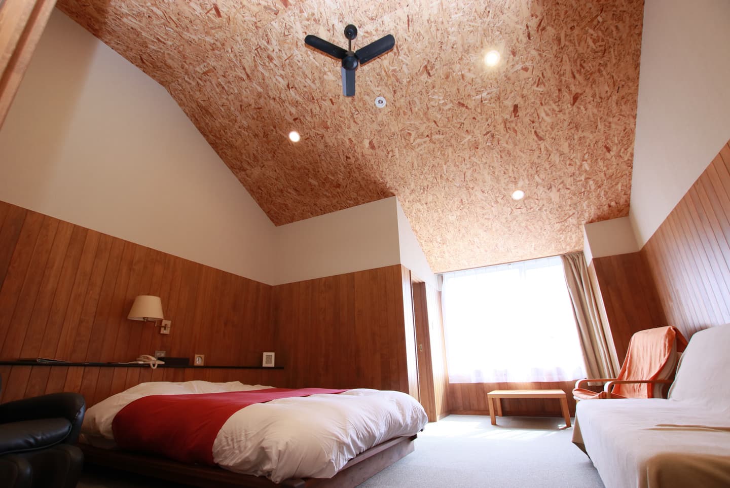 ファミリータイプ、わくわくするロフト付きのお部屋、ゆったりシングルでも、わいわいベッドを並べても。窓からの景色も心地よい自然を感じられます。